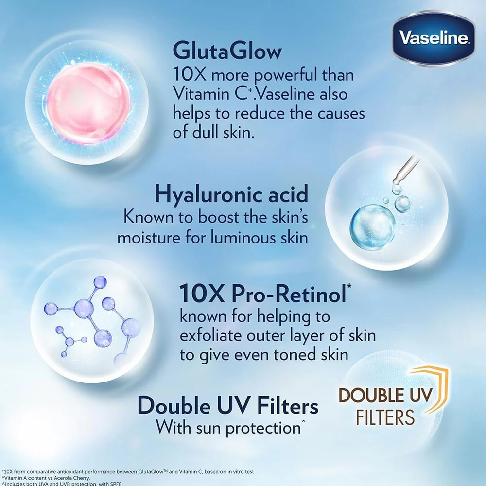 Transform dull, uneven skin with Vaseline Even Tone Body Lotion powered by 10X Gluta-Hya technology. This advanced body lotion is designed to deeply hydrate while helping to visibly improve skin tone, clarity, and radiance with regular use.